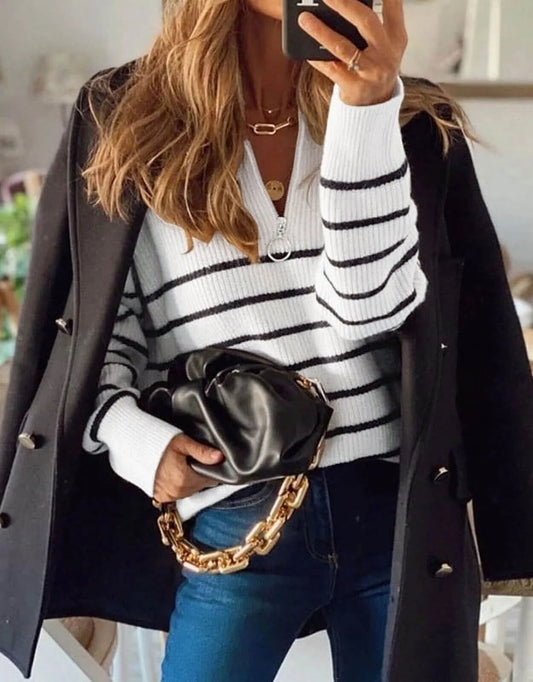 Sweaters for Women Quarter Zip Striped Sweaters Knitted Warm Pullover Sweaters